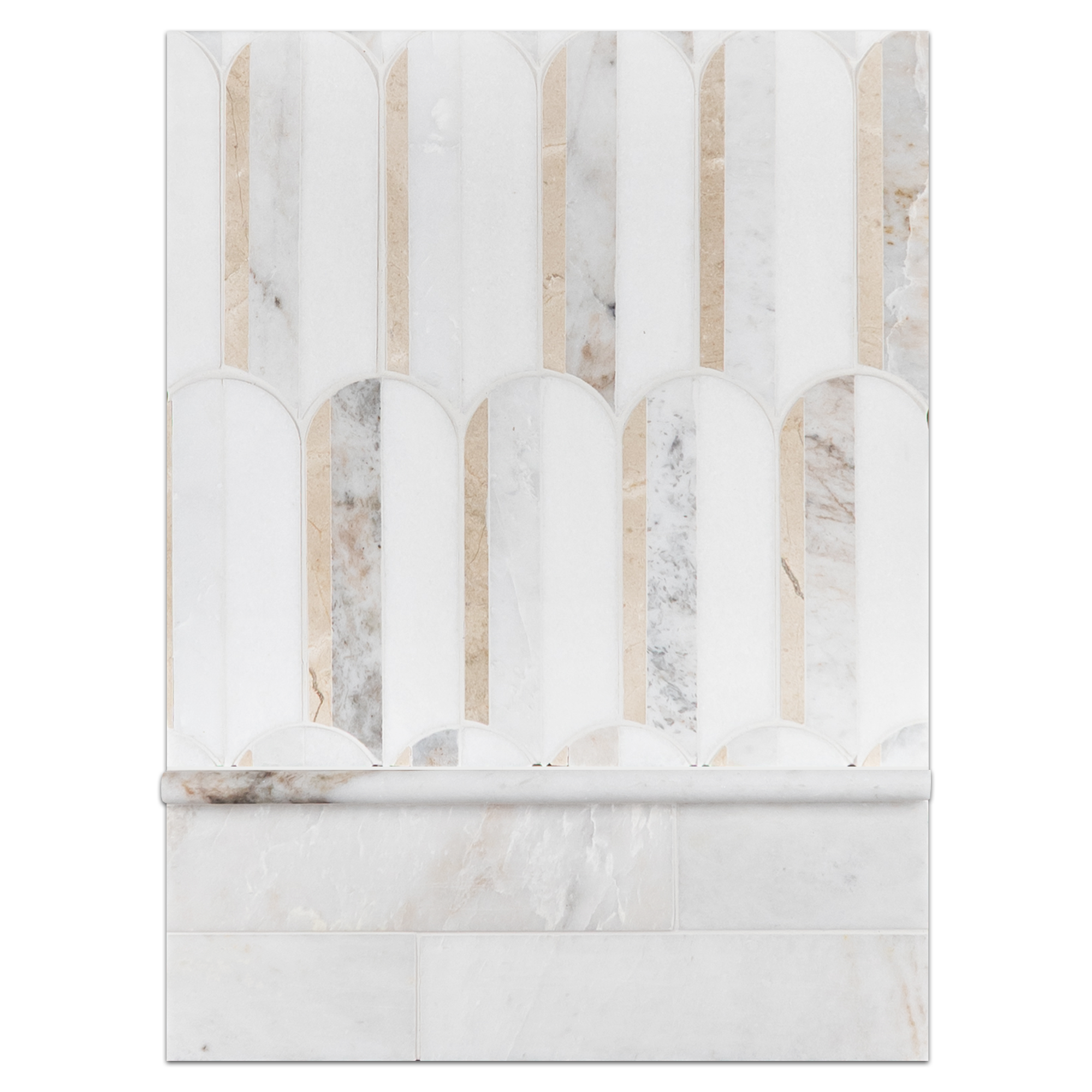 - Crema Marfil, Bianco Oro & White Thassos Tri-Blend Wave Mosaic Honed