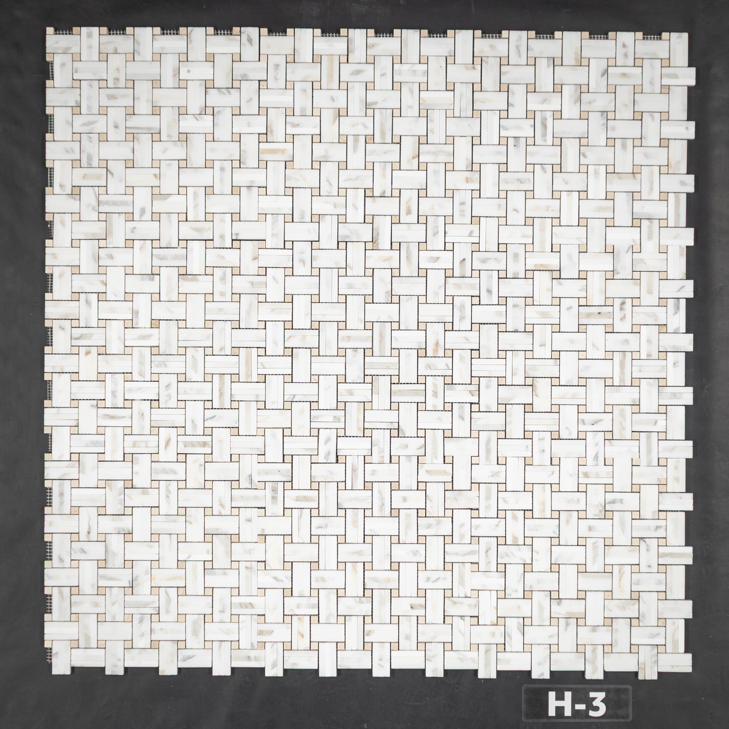 Calacatta Tri-Weave with 3/8" Crema Marfil Dot Mosaic Honed