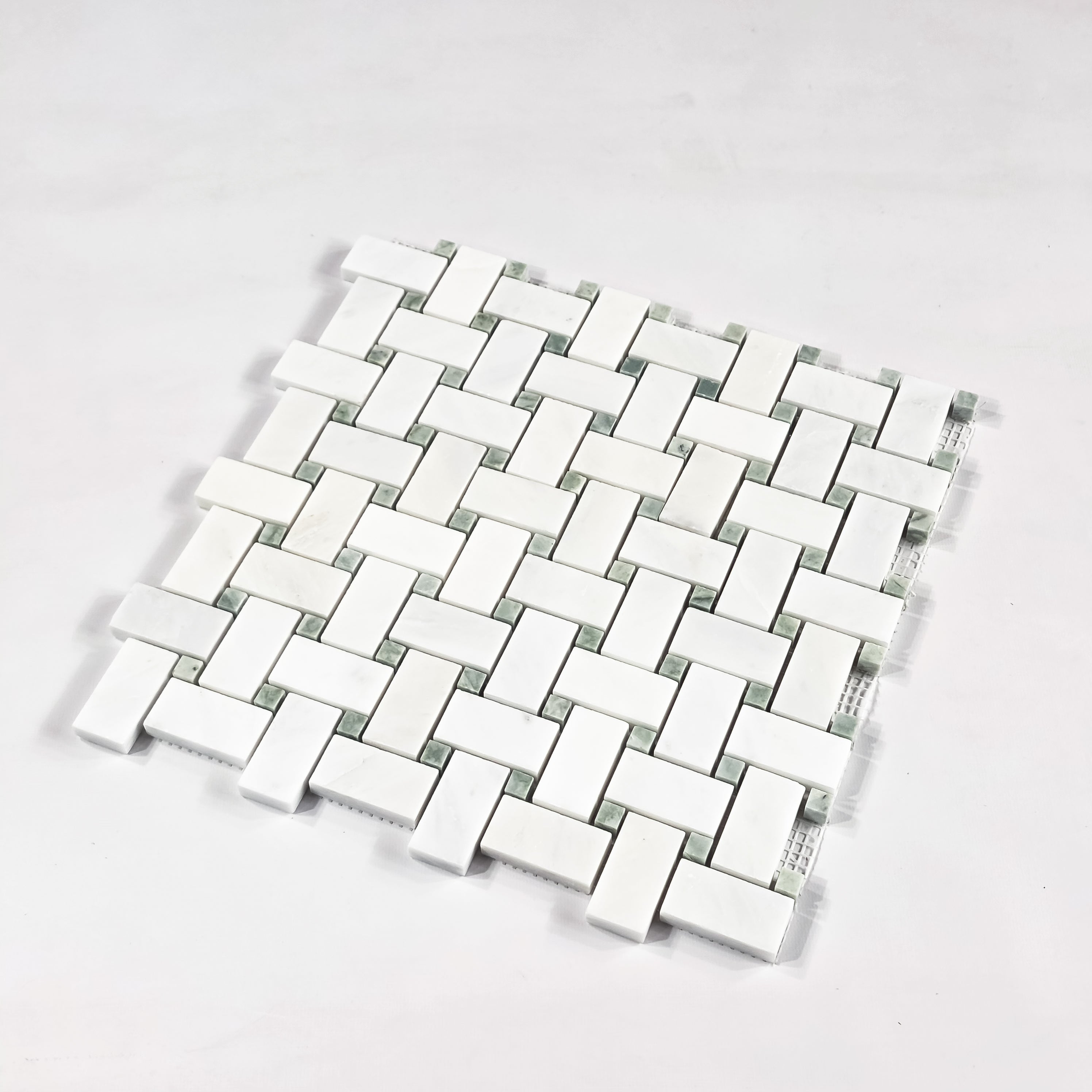 Pearl White Basketweave with 3/8" Emerald Green Dot Mosaic Honed