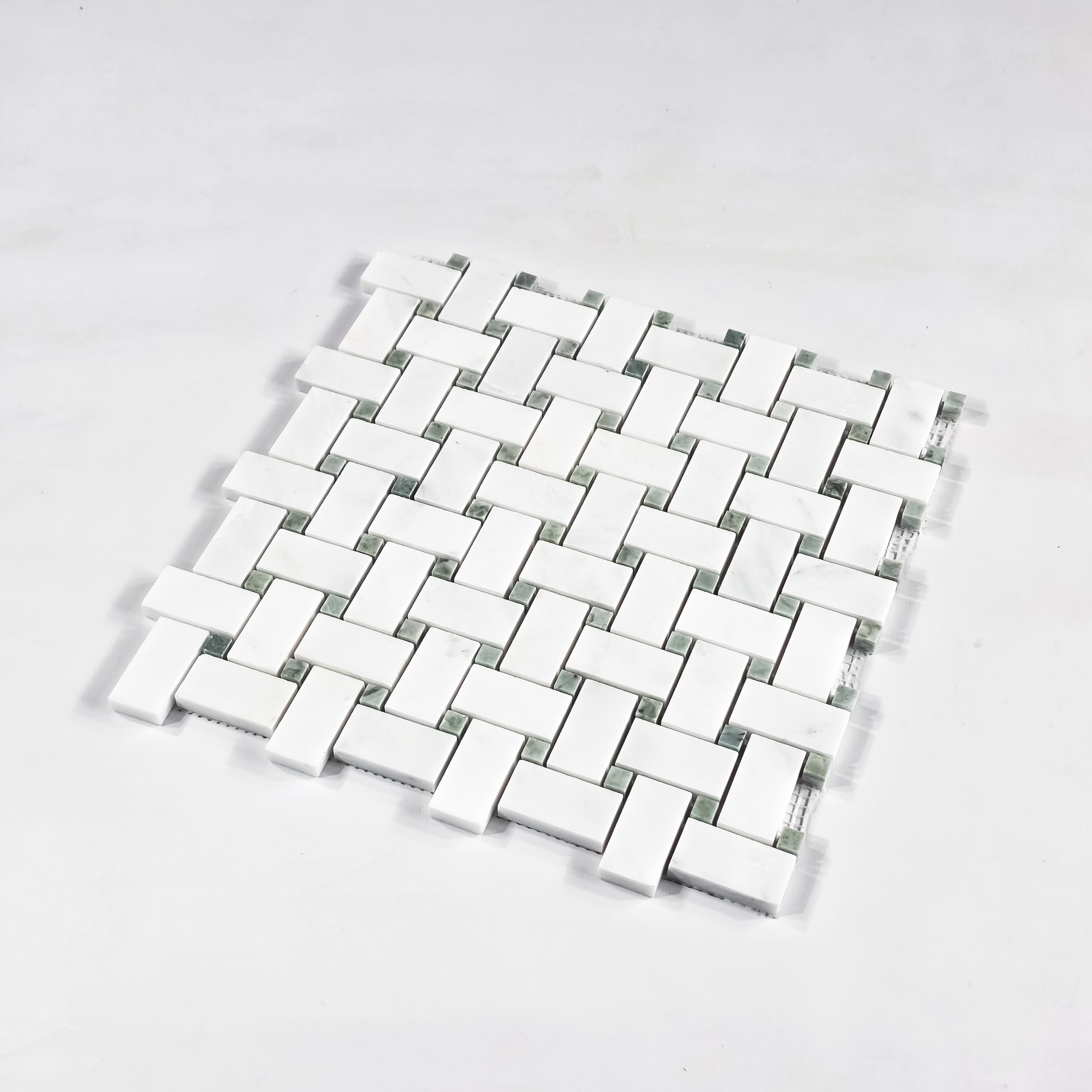 Pearl White Basketweave with 3/8" Emerald Green Dot Mosaic Polished