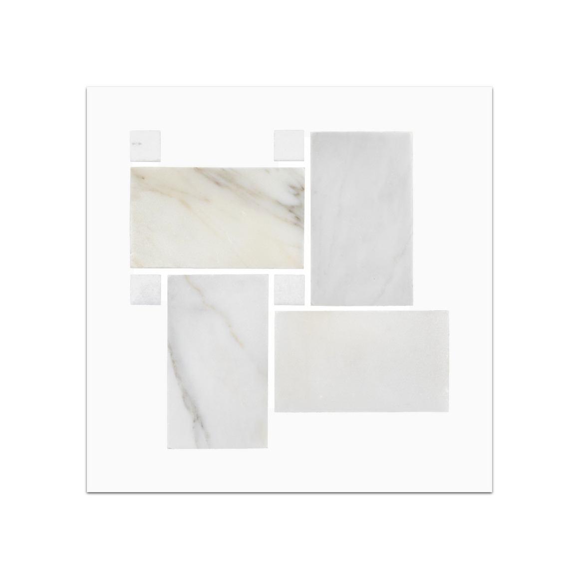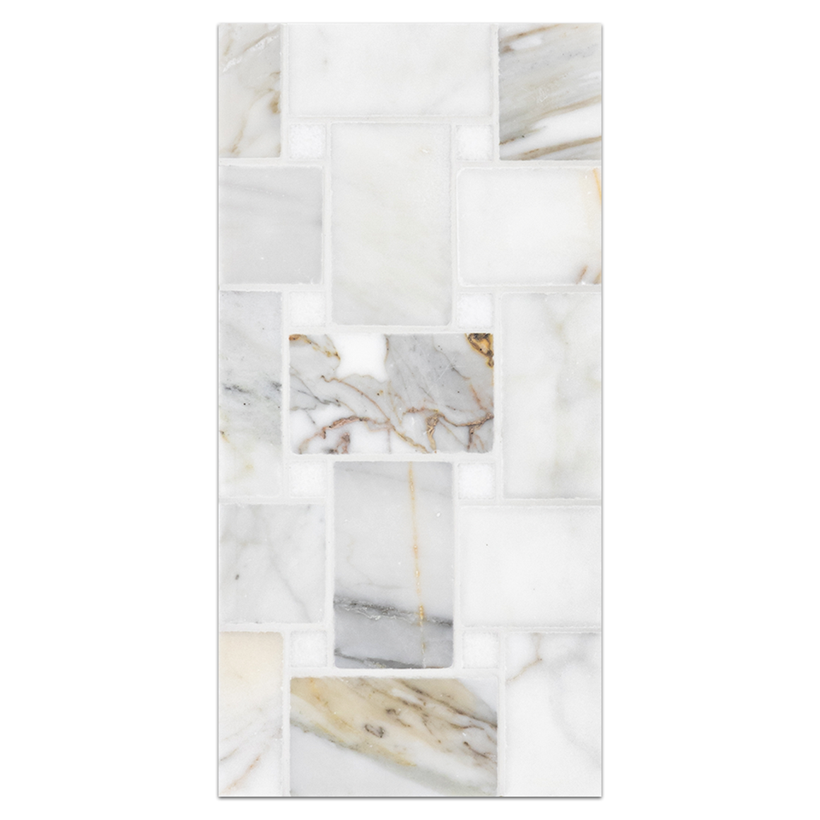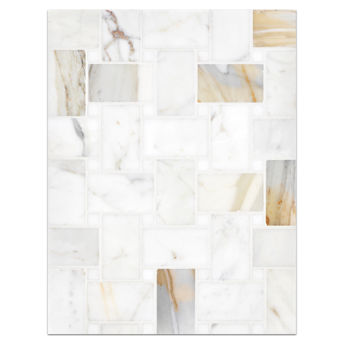 Calacatta Gold Extra Large Basketweave with 5/8" White Thassos Dot Mosaic Honed