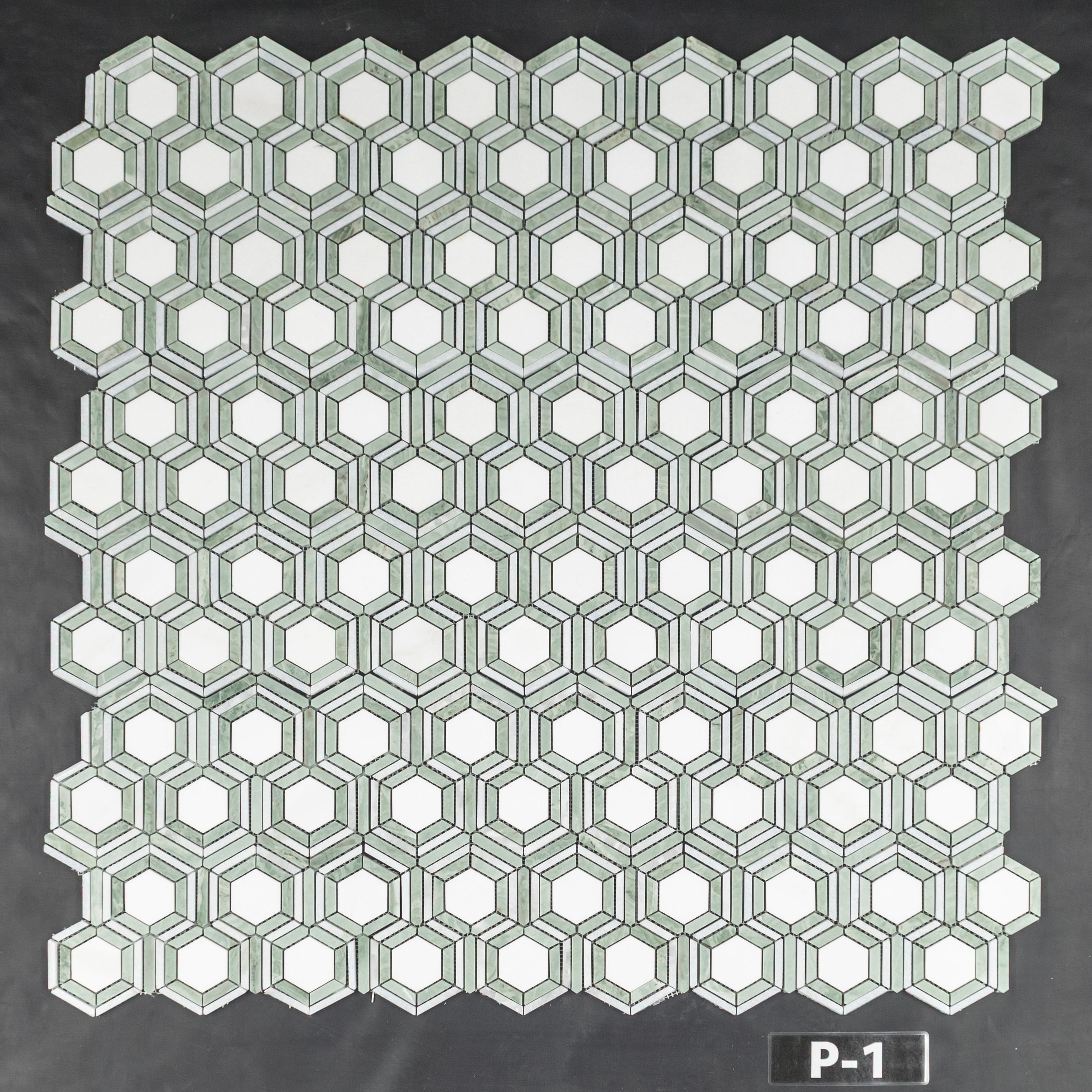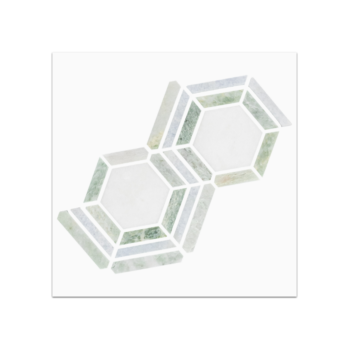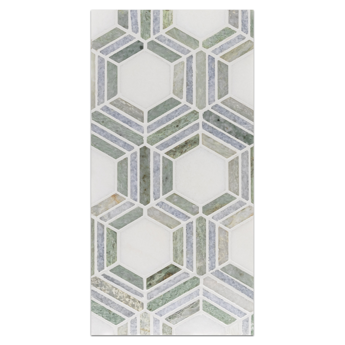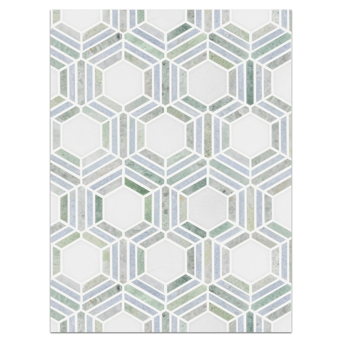 White Thassos Kaleidoscope with Blue Celeste and Ming Green Mosaic Polished