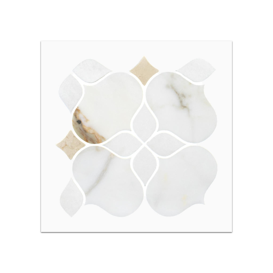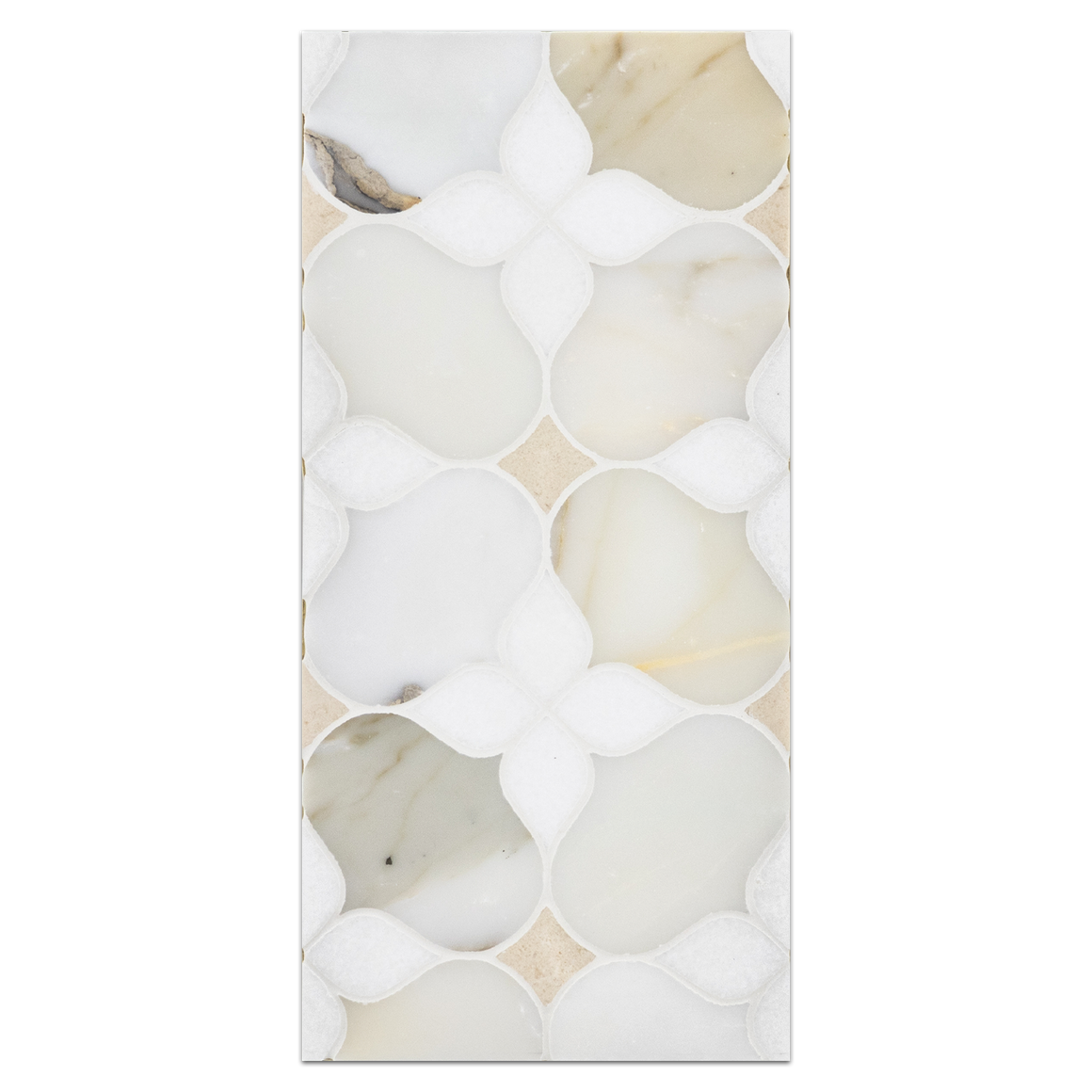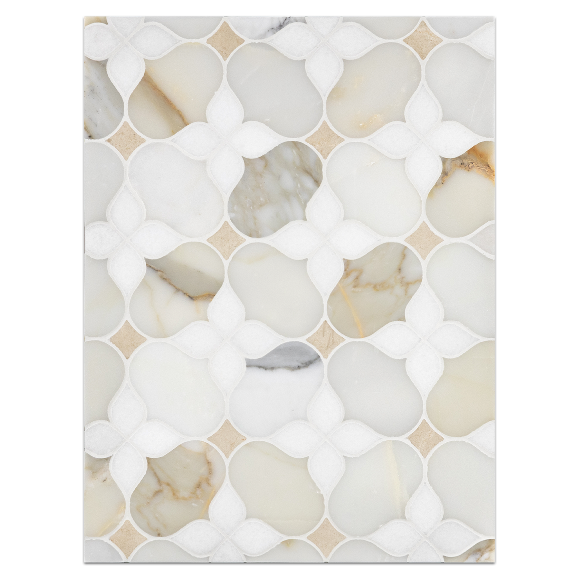 Calacatta Gold Silhouette with White Thassos and Crema Marfil Mosaic Honed