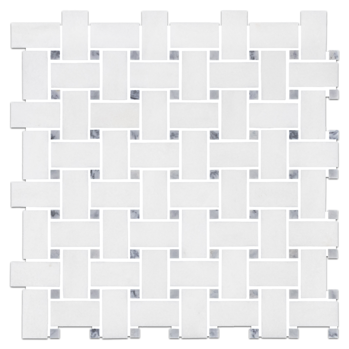 AM9048P - White Thassos Basketweave with 3/8" Pacific Gray Dot Mosaic Polished