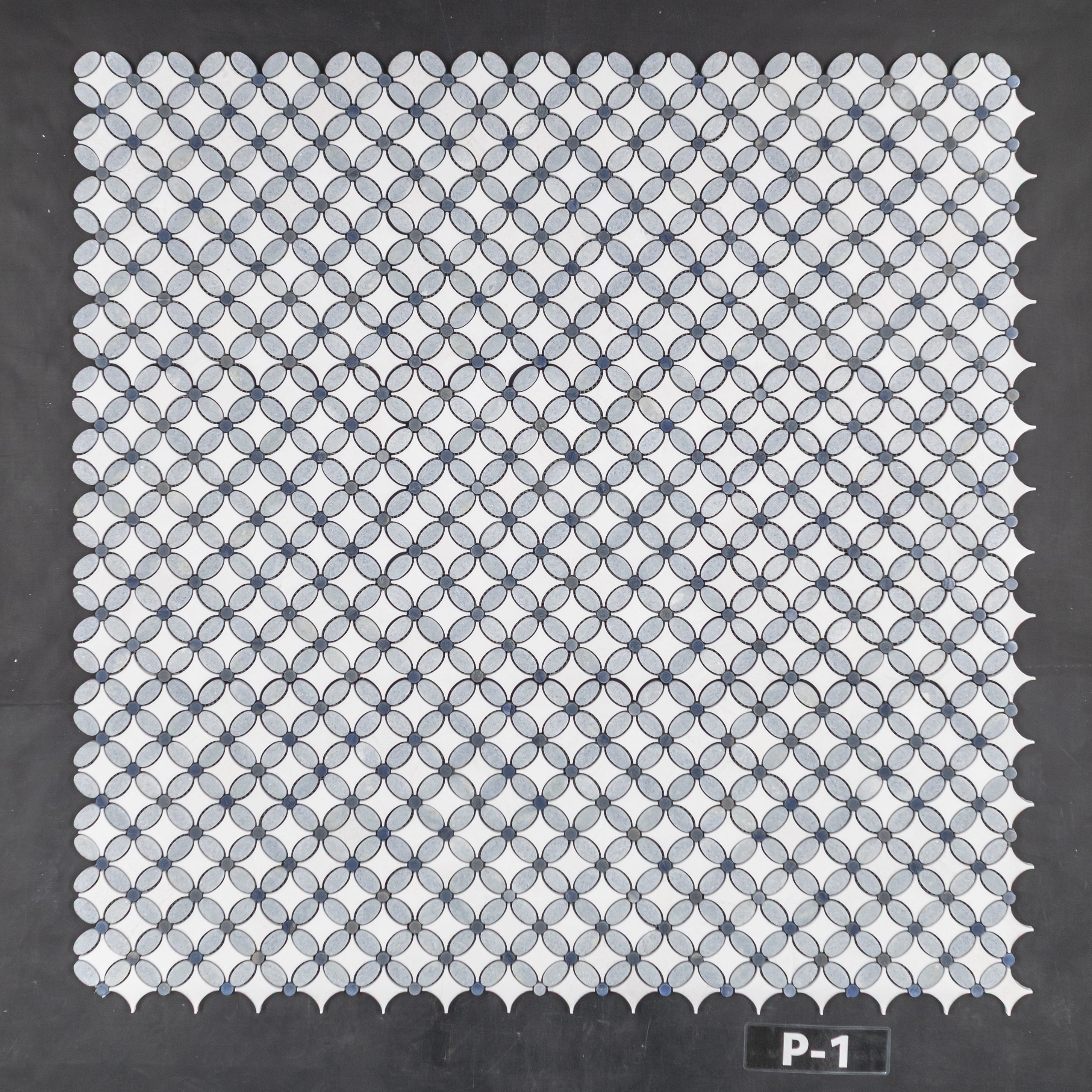 Azul Celeste Fleur con Thassos blanco y mosaico de puntos Azul Macauba pulido
