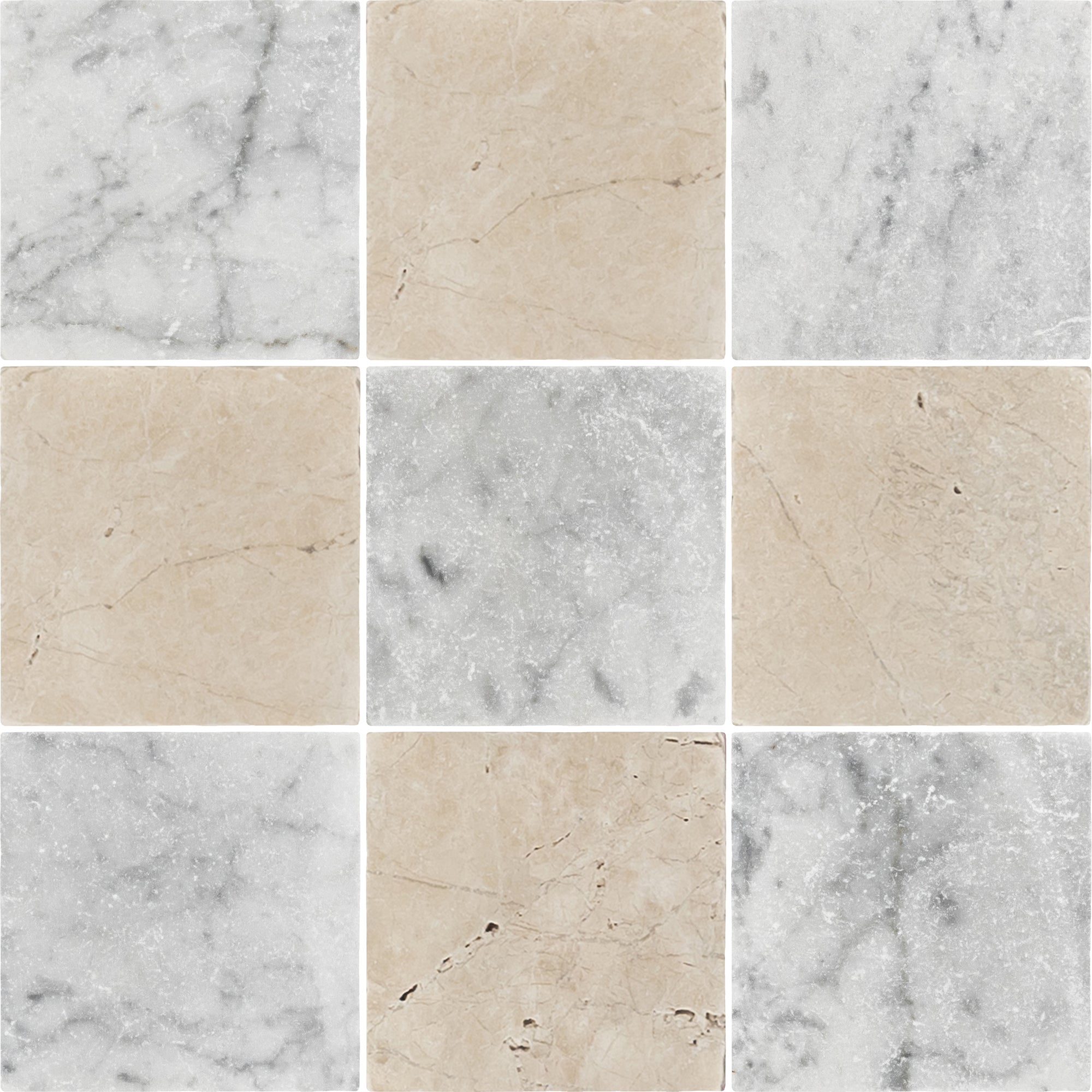 Bianco Carrara 4" x 4" Tumbled & Vanilla Royale 4" x 4" Tumbled Checkerboard Board