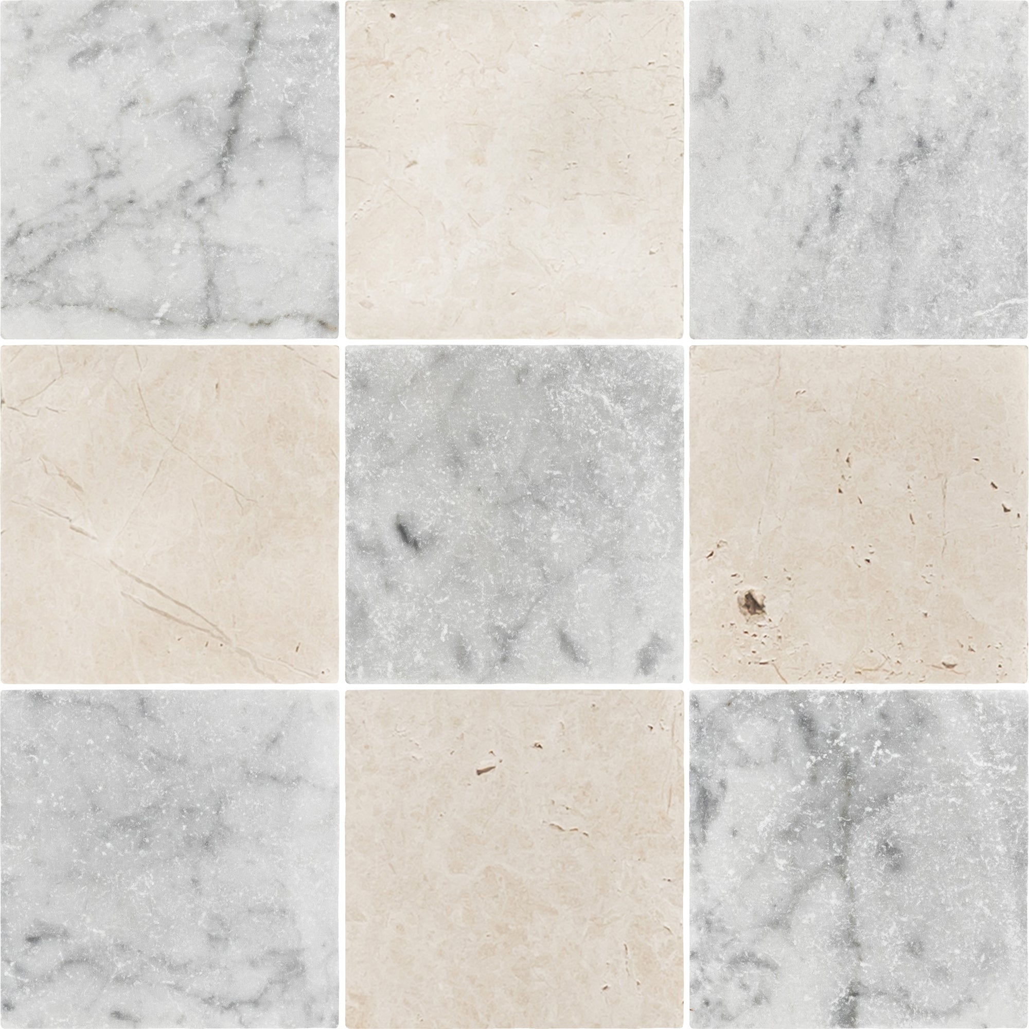 Bianco Carrara 4" x 4" Tumbled & Alba Nova 4" x 4" Tumbled Checkerboard Board