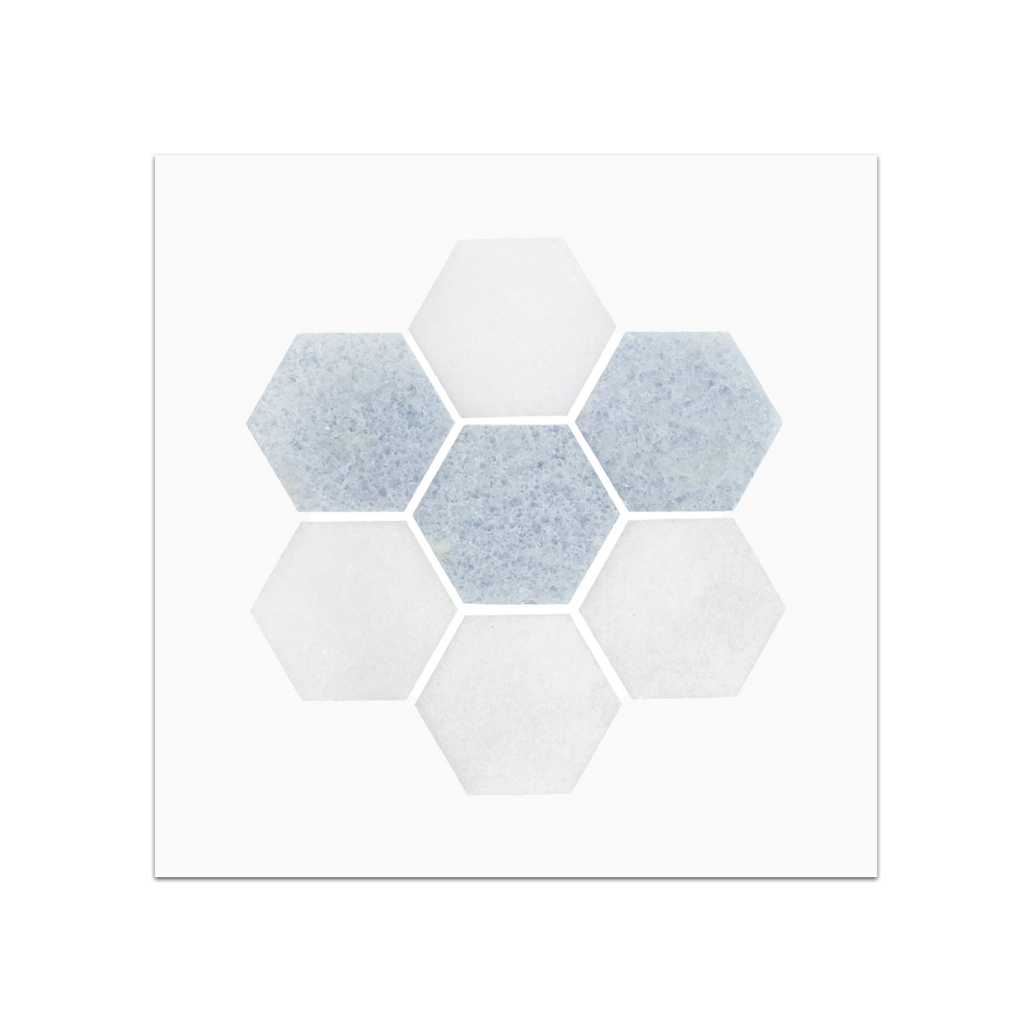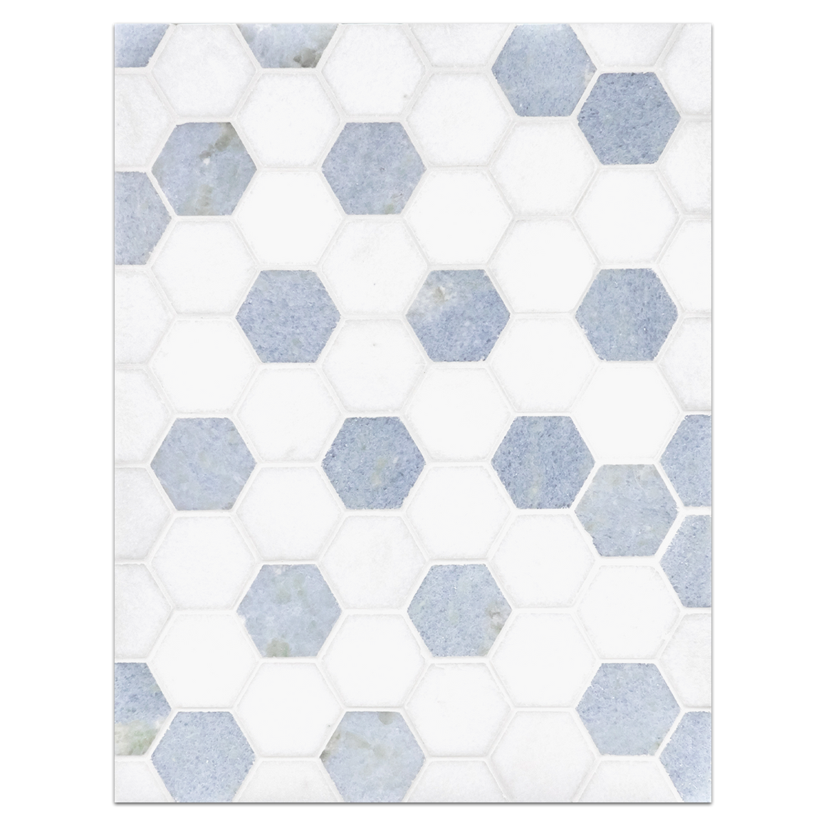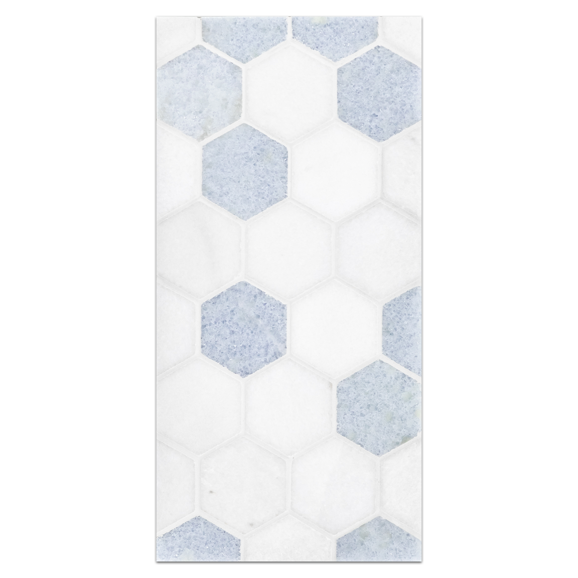 Mosaico hexagonal blanco Thassos y azul Celeste de 2" pulido