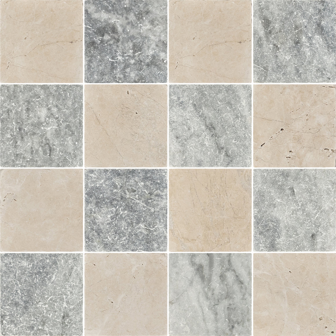 Vanilla Royale 4" x 4" Tumbled & Bardiglio Nuvolato 4" x 4" Tumbled Checkerboard Board